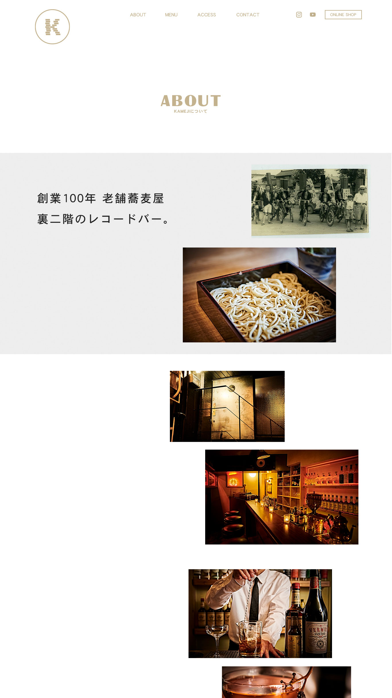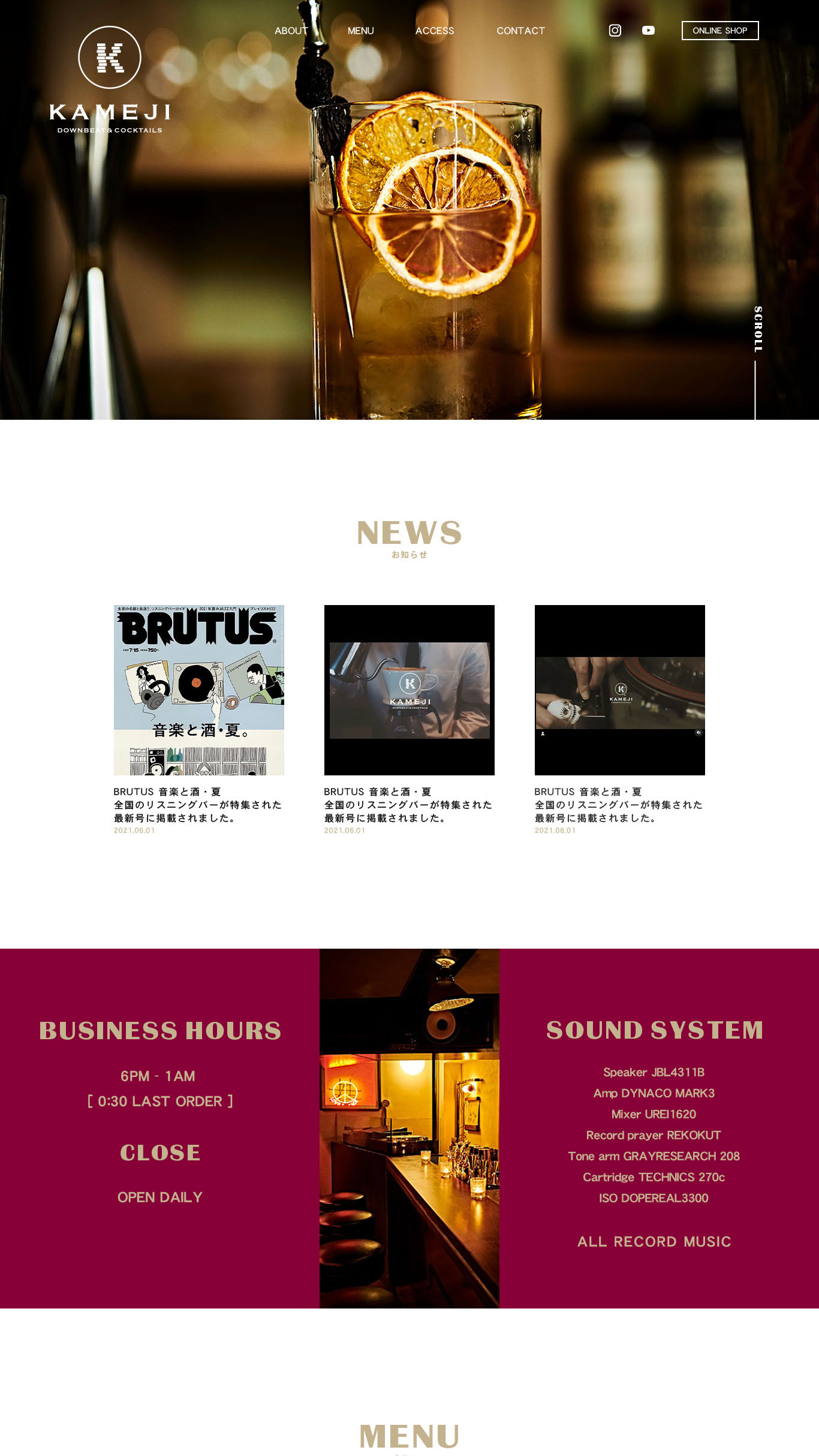 福島県福島市の創業100年老舗蕎麦屋『おかめや』の2階に2021年にオープンしたレコードバー、『KAMEJI 亀治』さんのホームページのデザイン、コーディングを担当しました。この道16年のバーテンダー兼オーナーさんの拘りが詰まったお店は実際に現場で体感し、お店に関してのイメージのすり合わせ、お店作りの参考にしているという海外のバーのリサーチを念入りに行いました。目指すヴィンテージ、少しモダンなイメージに沿ったデザインを心がけました。