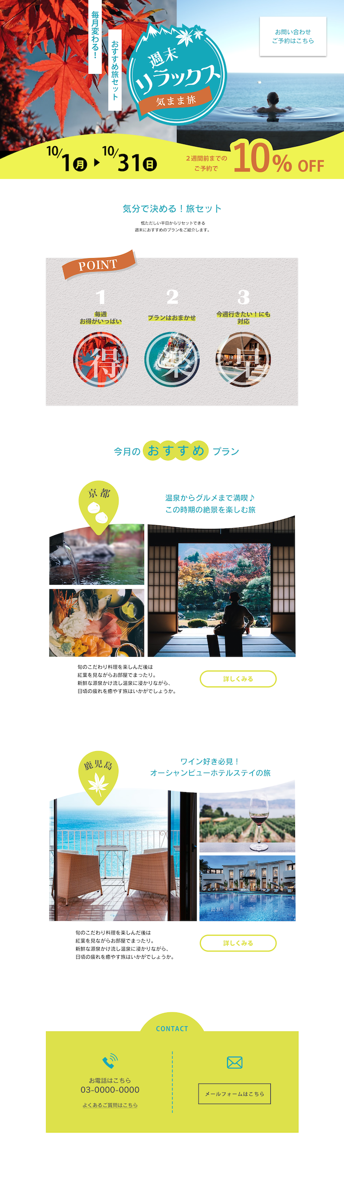 訓練校の課題でランディングページのワイヤーフレーム、デザインカンプを作成しました。バナーに使ったロゴの流れるようなフォントや、目を引く配色など、旅行バナーをリサーチしデザインに落とし込みました。